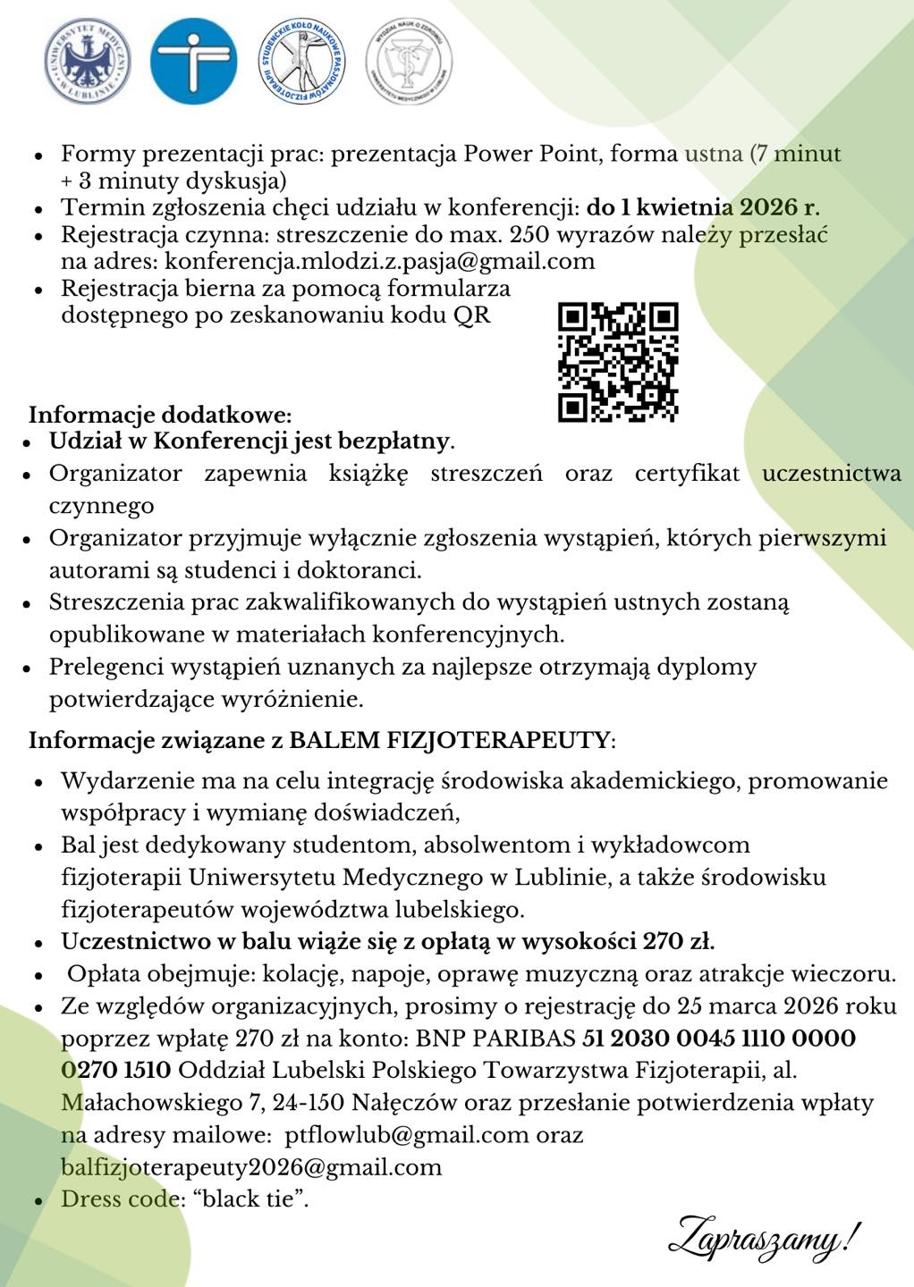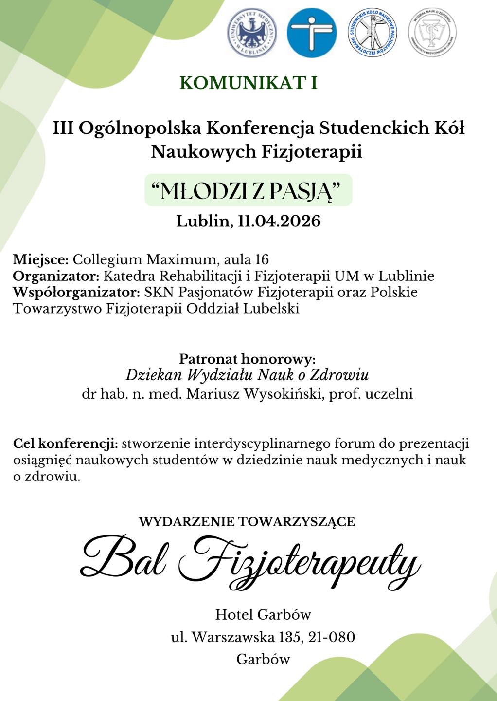 Serdecznie zapraszamy do udziału w III Ogólnopolskiej Konferencji Studenckich Kół Naukowych Fizjoterapii „Młodzi z pasją” oraz wyjątkowym "Balu Fizjoterapeuty", które odbędą się 11 kwietnia 2026 roku w Lublinie.
