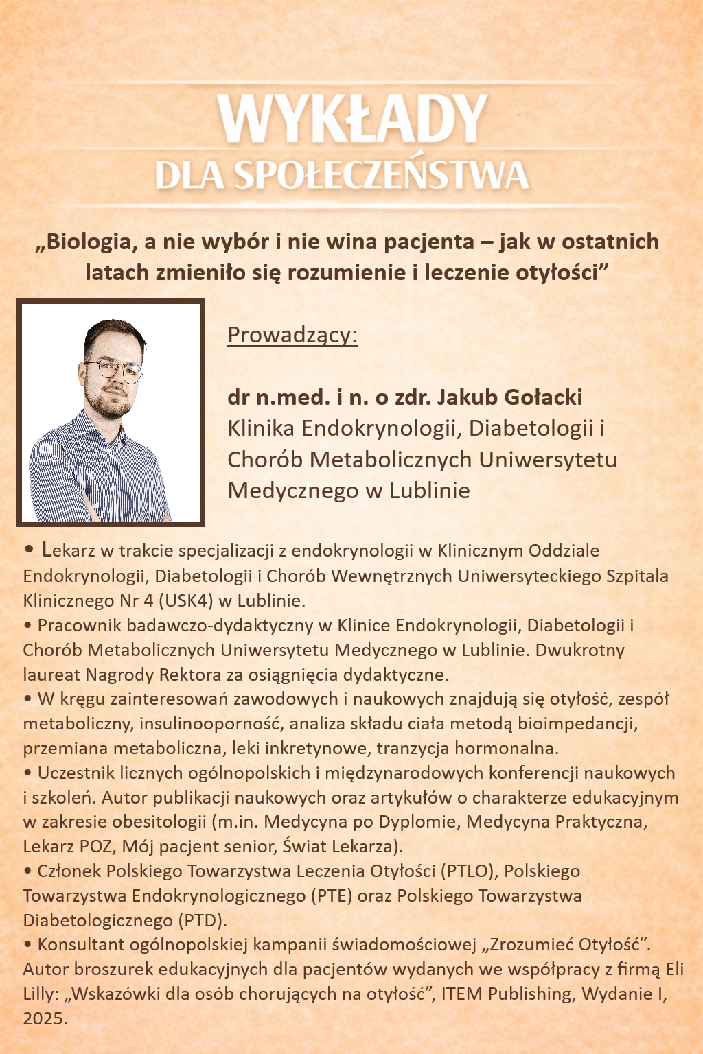 Prowadzący: dr n. med. i n. o zdr. Jakub Gołacki z Kliniki Endokrynologii, Diabetologii i Chorób Metabolicznych Uniwersytetu Medycznego w Lublinie