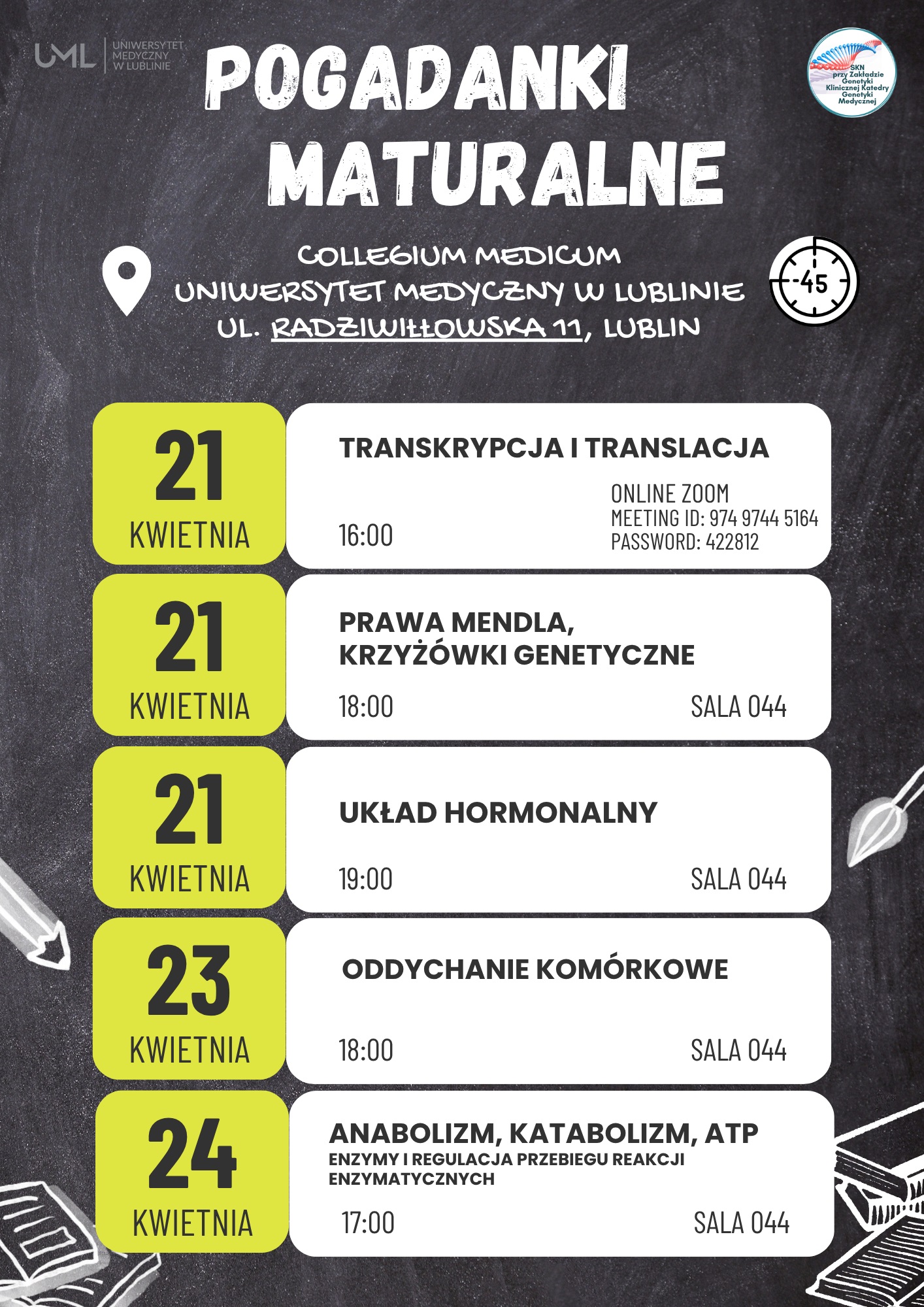 W imieniu Studenckiego Koła Naukowego działającego przy Zakładzie Genetyki Klinicznej Katedry Genetyki Medycznej zapraszamy wszystkich maturzystów do wspólnej powtórki na Uniwersytecie Medycznym w Lublinie. Spotkania będą również doskonałą okazją do rozmowy ze studentami na temat przygotowań do egzaminu maturalnego oraz studiów.