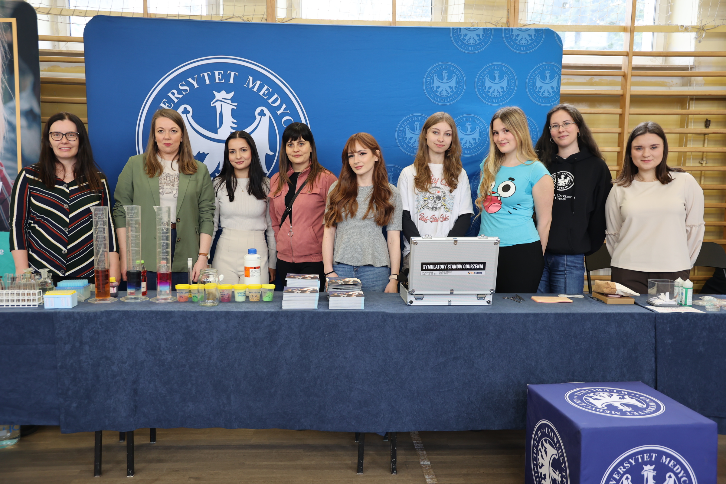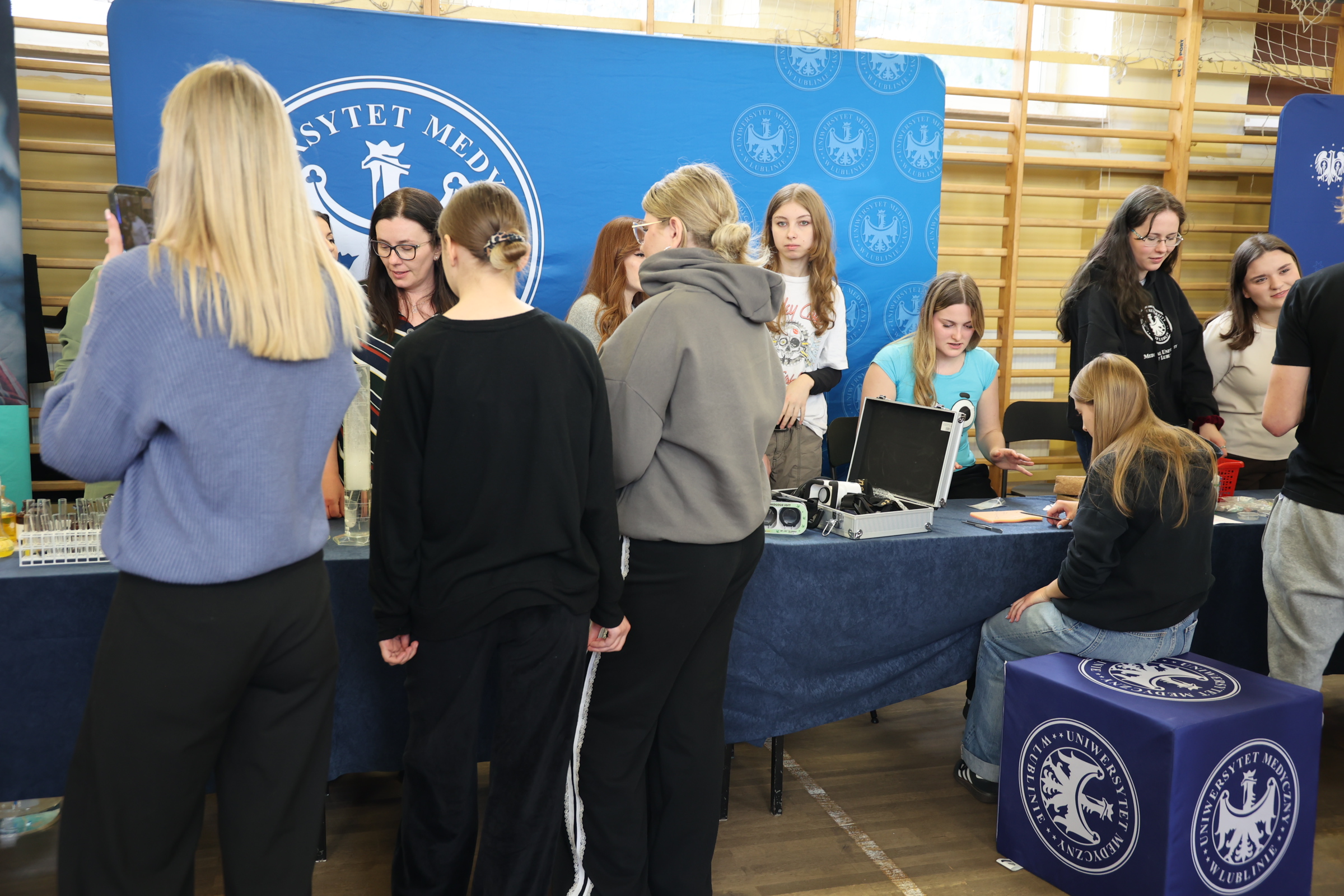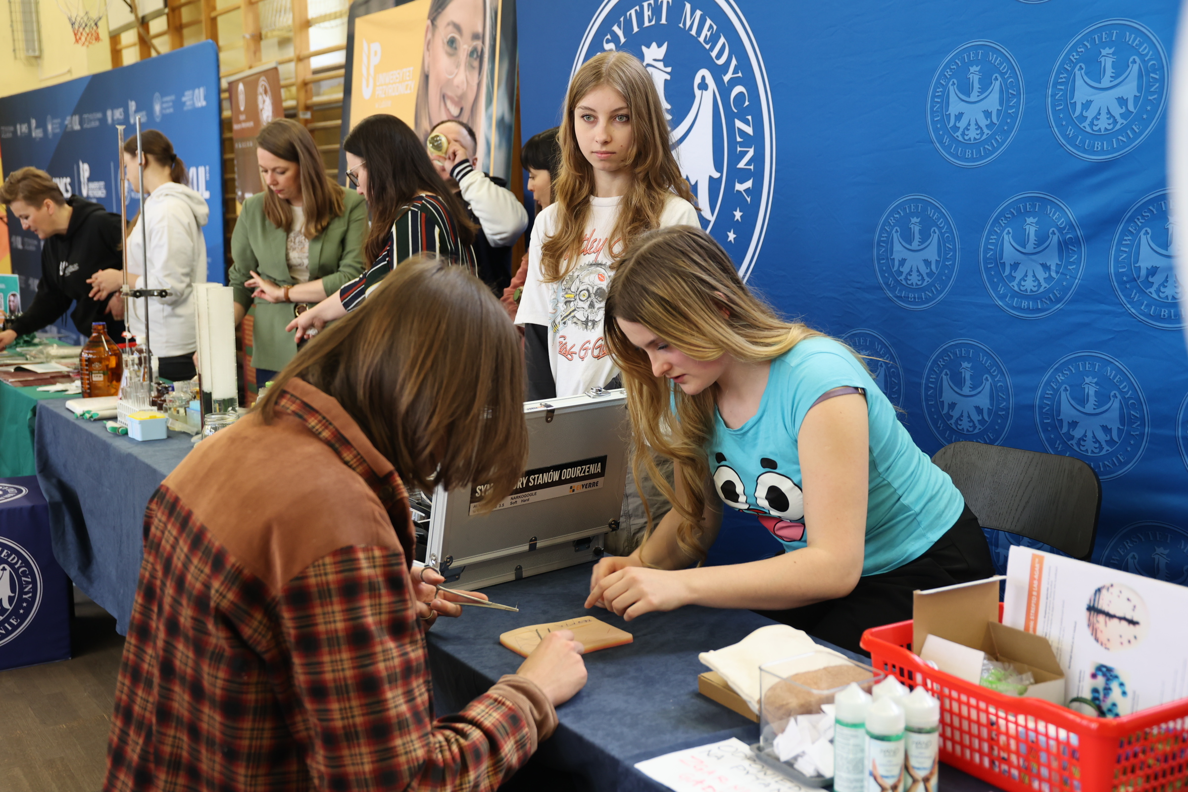 Podczas spotkania przy stoisku UMLUB licealiści z VI LO przy ul. Mickiewicza w Lublinie mogli sprawdzić, jak poradzą sobie z zestawem do szycia chirurgicznego, przetestować symulatory stanów odurzenia (alkogogle i narkogogle) oraz zobaczyć pokazy chemiczne.