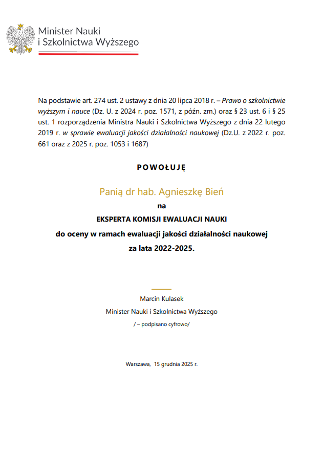 Z przyjemnością informujemy, że pani dr hab. Agnieszka Bień, prof. uczelni, oraz pan prof. dr hab. Tomasz Plech pracownicy Wydziału Nauk o Zdrowiu UM w Lublinie zostali powołani przez Ministra Nauki i Szkolnictwa Wyższego Marcina Kulaska na ekspertów Komisji Ewaluacji Nauki do oceny w ramach ewaluacji jakości działalności naukowej za lata 2022–2025.