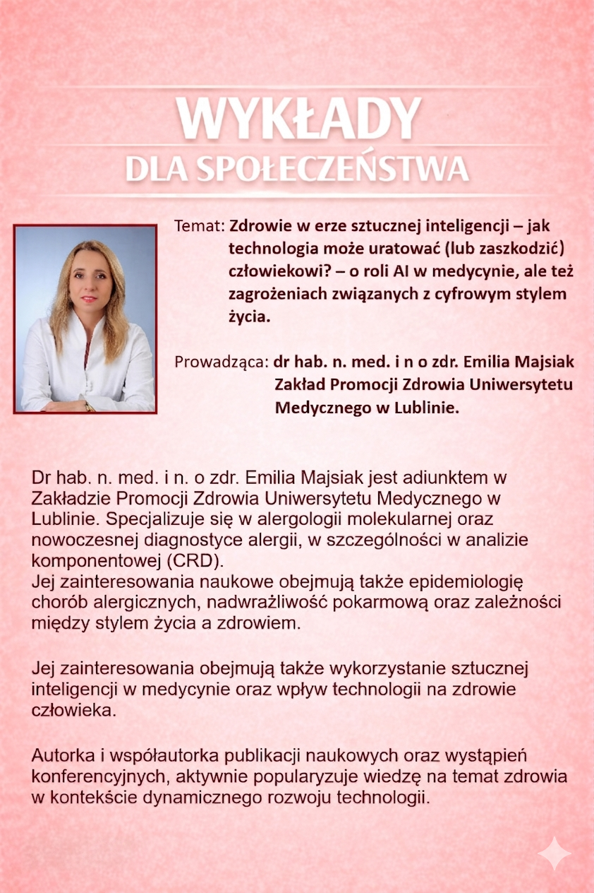 Wykład: „Zdrowie w erze sztucznej inteligencji – jak technologia może uratować (lub zaszkodzić) człowiekowi? – o roli AI w medycynie, ale też zagrożeniach związanych z cyfrowym stylem życia”