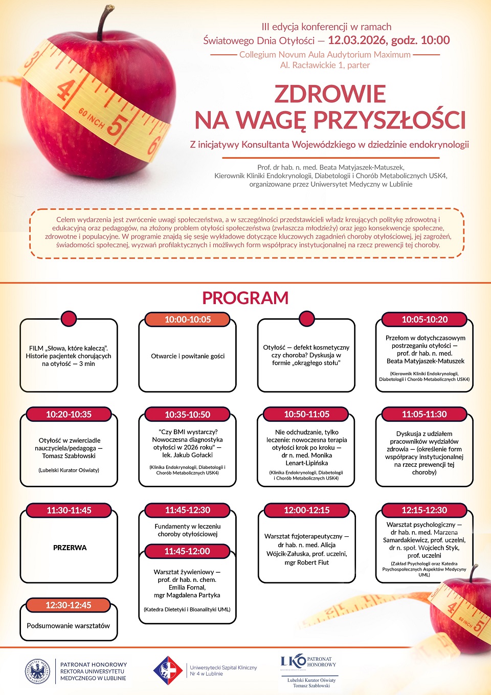 - 10:20 – Otyłość w zwierciadle nauczyciela/pedagoga – wykład Lubelskiego Kuratora Oświaty, pana Tomasza Szabłowskiego