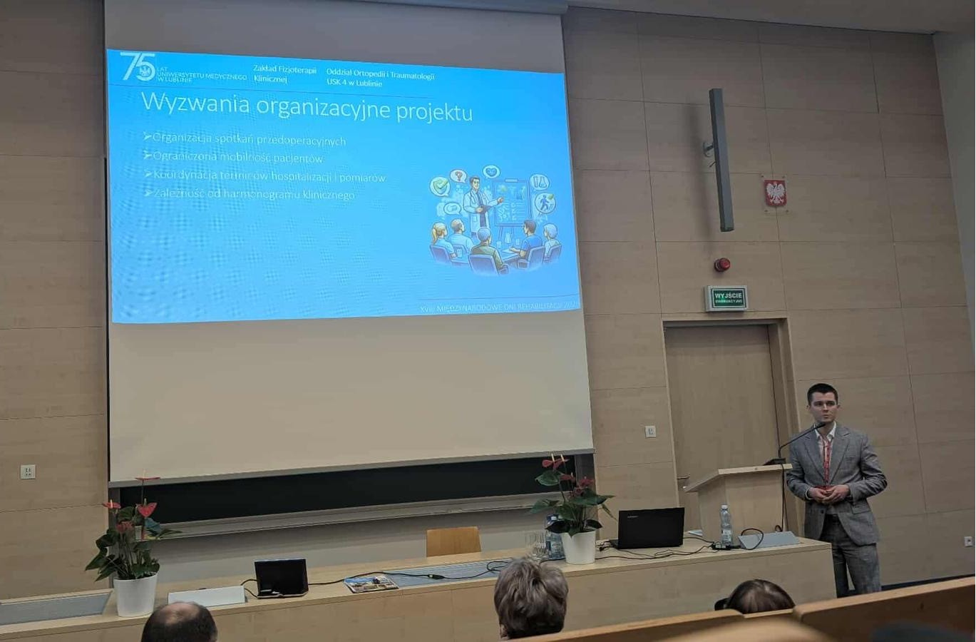 Mgr Paweł Hereć przedstawił pracę dotyczącą wyzwań metodologicznych i organizacyjnych związanych z realizacją programu prehabilitacji ruchowej u pacjentów przygotowywanych do endoprotezoplastyki stawu biodrowego. W prezentacji zwrócił uwagę na znaczenie odpowiedniego planowania programu ćwiczeń, monitorowania jego realizacji oraz trudności związane z prowadzeniem badań klinicznych w warunkach okołooperacyjnych.