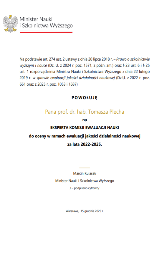 Z przyjemnością informujemy, że pani dr hab. Agnieszka Bień, prof. uczelni, oraz pan prof. dr hab. Tomasz Plech pracownicy Wydziału Nauk o Zdrowiu UM w Lublinie zostali powołani przez Ministra Nauki i Szkolnictwa Wyższego Marcina Kulaska na ekspertów Komisji Ewaluacji Nauki do oceny w ramach ewaluacji jakości działalności naukowej za lata 2022–2025.