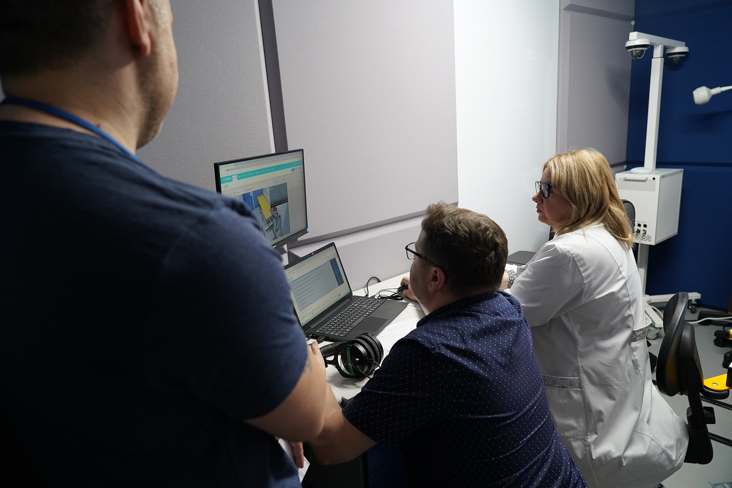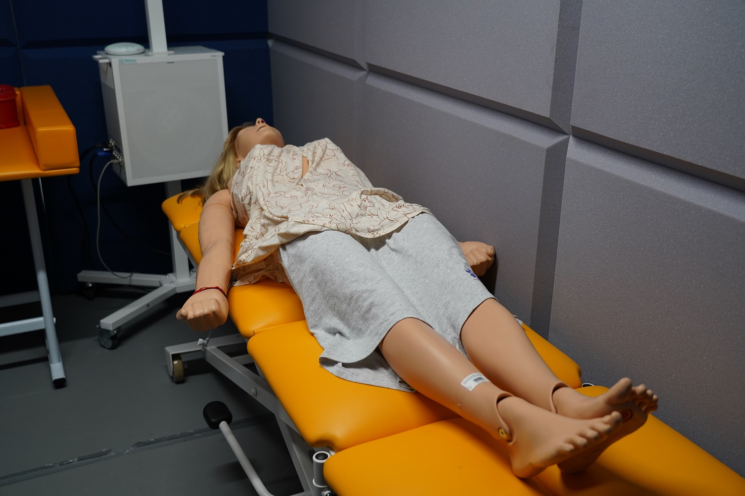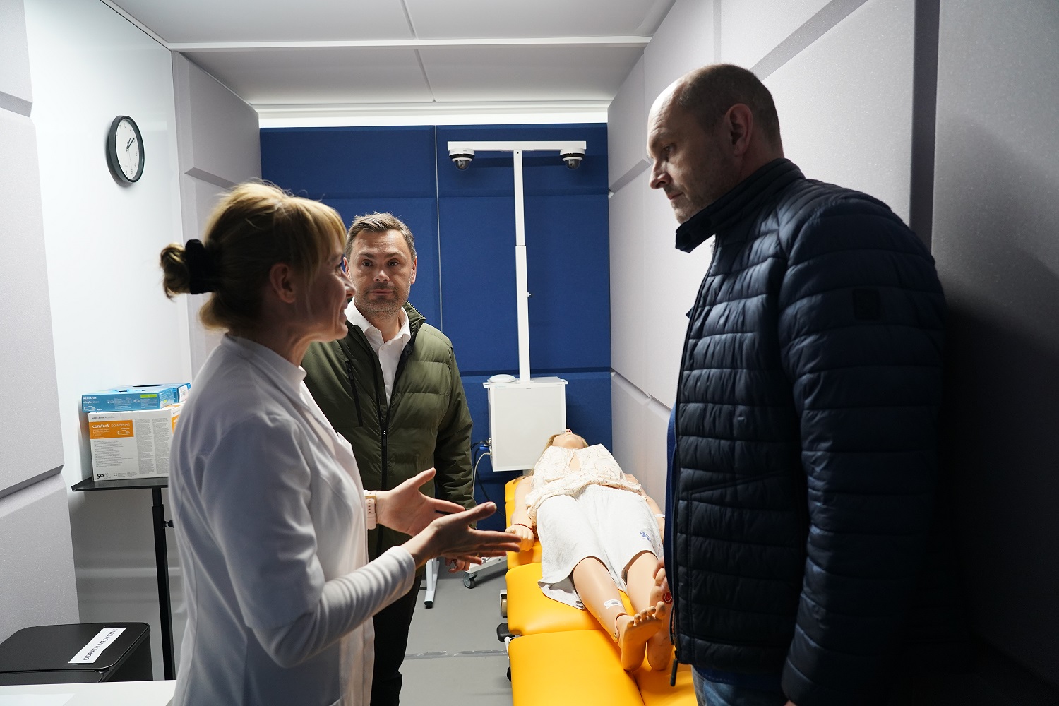 Egzamin został przeprowadzony z wykorzystaniem fantomów oraz stanowisk symulacyjnych odzwierciedlających realne sytuacje kliniczne. Obejmował on krótkie, zadaniowe scenariusze, podczas których studenci byli obserwowani przez egzaminatorów za pośrednictwem systemu kamer. Każdemu stanowisku egzaminacyjnemu przypisano odpowiadający mu boks komisji, co umożliwiało sprawną i jednoczesną ocenę przebiegu poszczególnych zadań. Dodatkowo zapewniono stałe połączenie głosowe z koordynatorem egzaminu, który czuwał nad organizacją pracy, monitorował czas oraz nadawał tempo przechodzenia między kolejnymi stacjami, ponieważ studenci musieli sprawnie rotować między stanowiskami zgodnie z harmonogramem.
